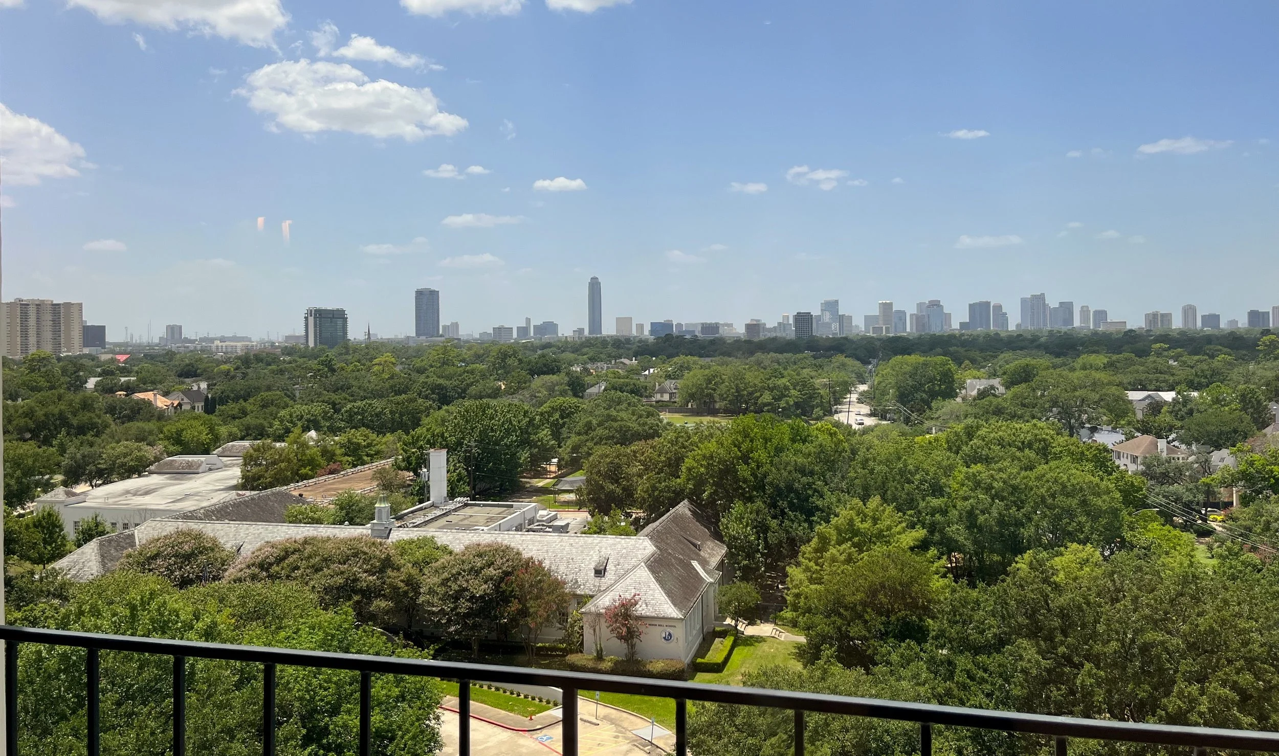 The suite has floor-to-ceiling windows facing River Oaks Elementary School and the River Oaks neighborhood extending toward the West Loop/Galleria area. Due to HOA restrictions for the neighborhood and the location of the school, it’s virtually impossible for any developer to block your views.
